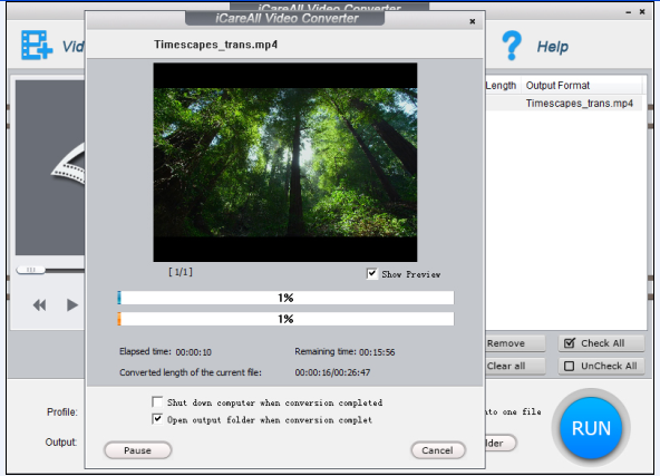 Click "Run" button to convert the video to the format you set. You can find the output video from the target drive you set to save it.